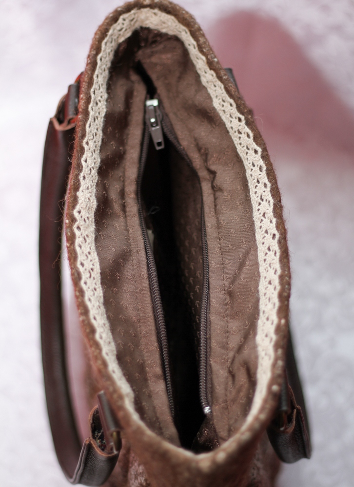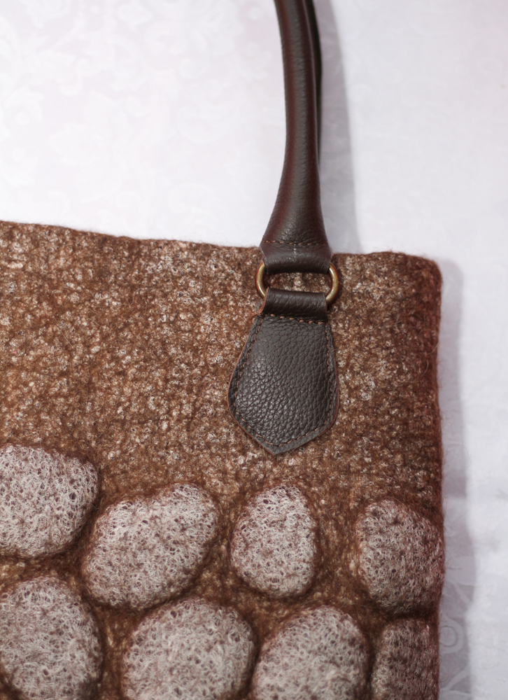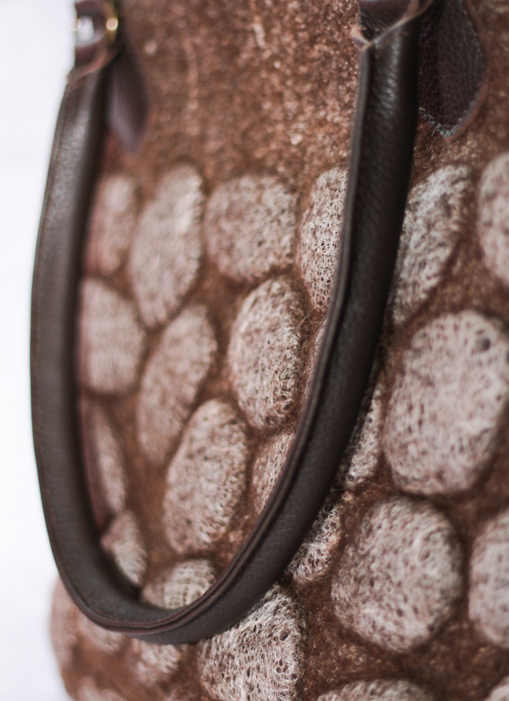 Geanta din lana impaslita manual, prin tehnica impaslirii umede. Geanta este captusita, se inchide cu fermoar si are doua manere fixe din piele ecologica. Cu un design deosebit, unicat din lana lucrat manual. Geanta este un produs unicat, accesoriu si un cadou elegant, inedit pentru toate doamnele ce doresc sa-si personalizeze stilul.