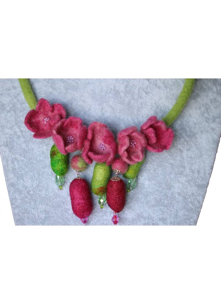 Set colier si cercei din lana impaslita, unicat, handmade, Ciclam-Verde
