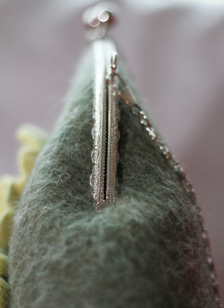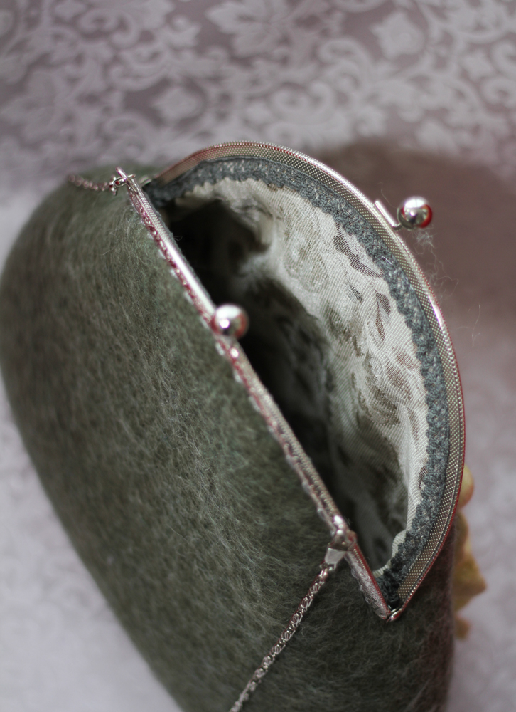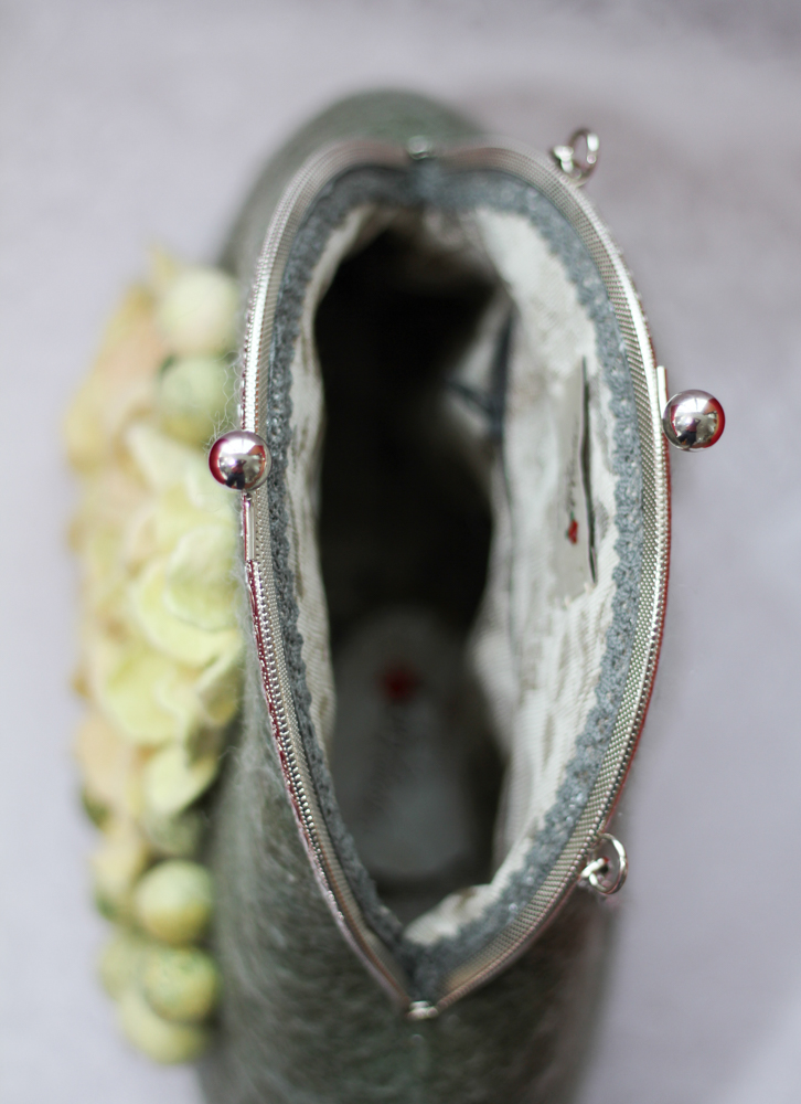 Geanta din lana impaslita manual, prin tehnica impaslirii umede, captusita, cu buzunar interior mic si inchidere metalica. Geanta are rama metalica si lant, cu aplicatii florale deosebite din lana lucrate manual. Geanta este un produs unicat, accesoriu si un cadou elegant, inedit pentru toate doamnele ce doresc sa-si personalizeze stilul.